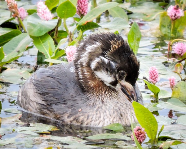 Pied-billed Grebe chick swimming in smartweed